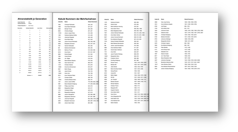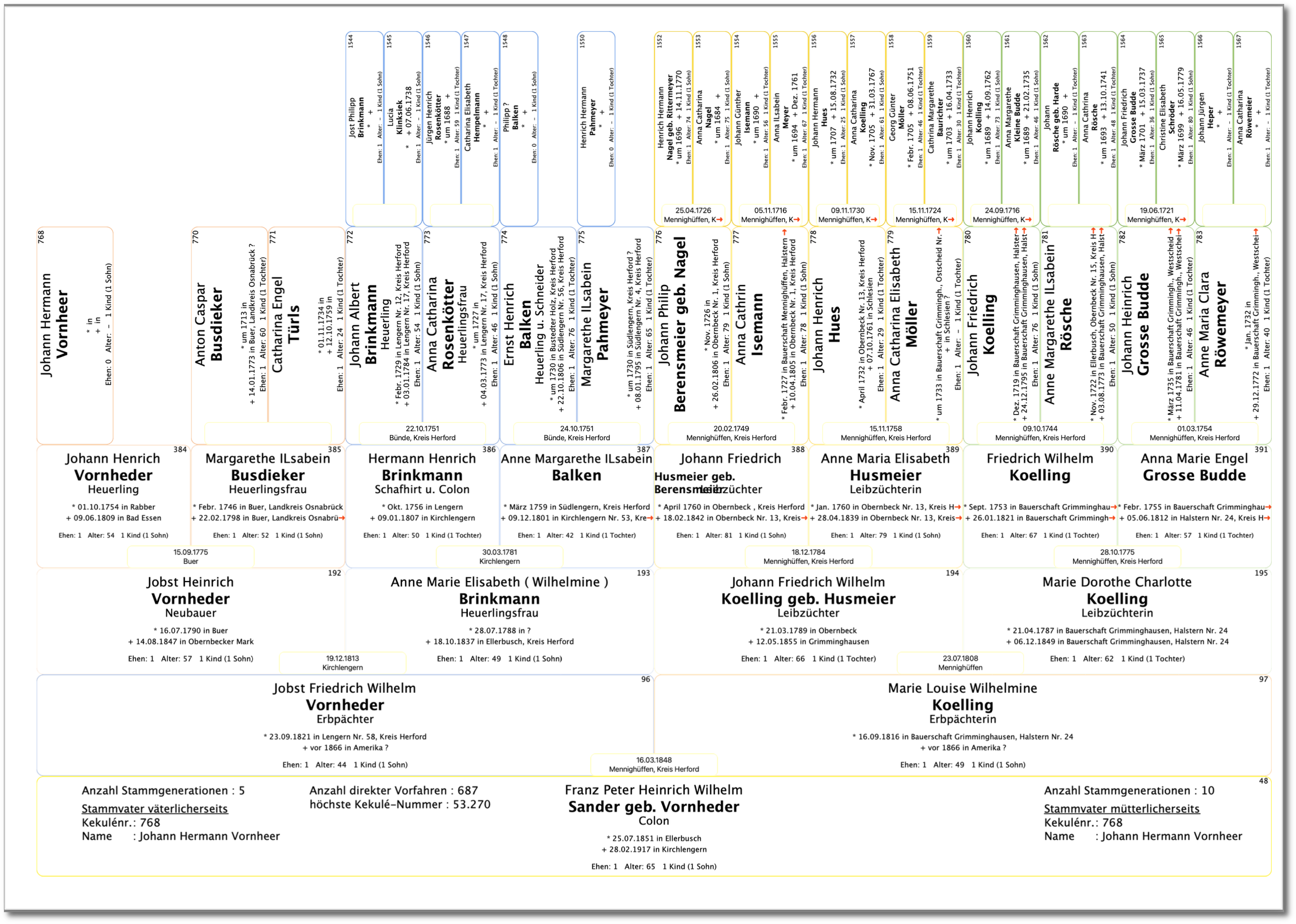 7kB) 23.03.2023 Mit dieser Druckvorlage erzeugen Sie eine Statistik über Ihren Ahnenverlust. Angezeigt werden Angaben zur Anzahl an Personen je Generation und den sich ggf. ergebenden Ahnenverlust. Auf den Folgeseiten werden zudem die Namen von Personen angezeigt, die mehrfach in einer Ahnentafel auftauchen. Die verschiedenen Kekulé-Nummern werden ebenfalls angegeben. |
