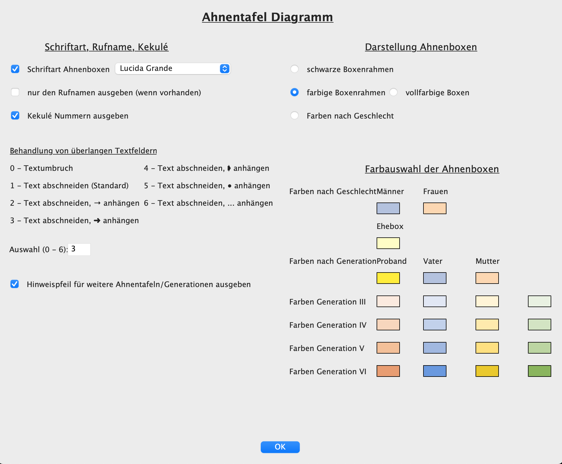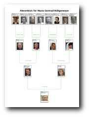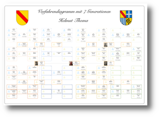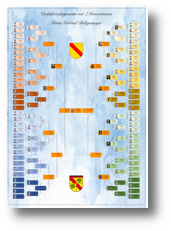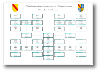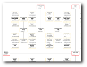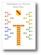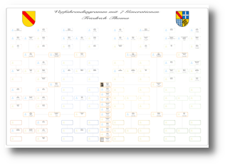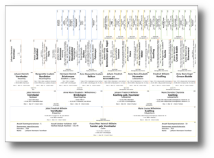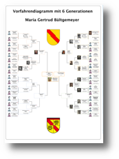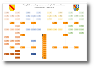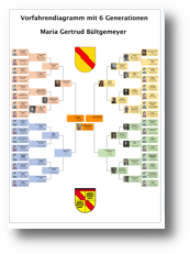 72kB) 13.03.2022![]() Diese Druckvorlage erzeugt eine Ahnentafel ab dem Stammhalter über alle vorhandenen Generationen. Jede Seite enthält maximal sechs Generationen und hat immer einen identischen Aufbau. Die erste Seite enthält immer den Satmmahlter und weitere sechs Generationen. Sind nach der sechsten Generation weitere Vorfahren vorhanden, erkennt man das an einem ">" hinter dem Datenfeld der letzten Generation. Für diese Person wird dann eine eigene Seite mit weiteren fünf Generationen erzeugt. Bei vielen Vorfahren können dadurch sehr viele Seiten erzeugt werden. Mit der neuen Version können Sie diverse Vorgaben zur gewünschten Ausgabe vorgeben. Bitte beachten Sie die beiliegende Liesmich-Datei! |