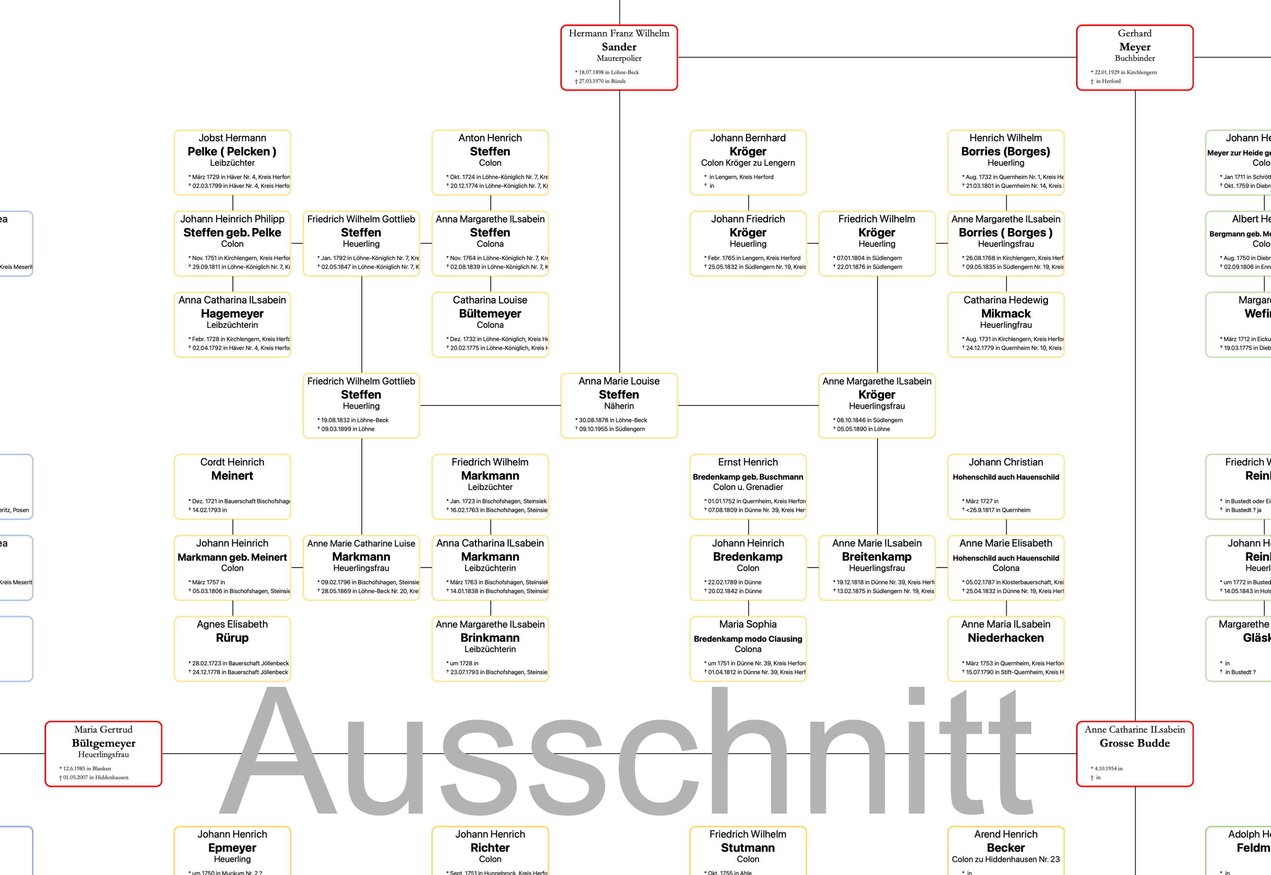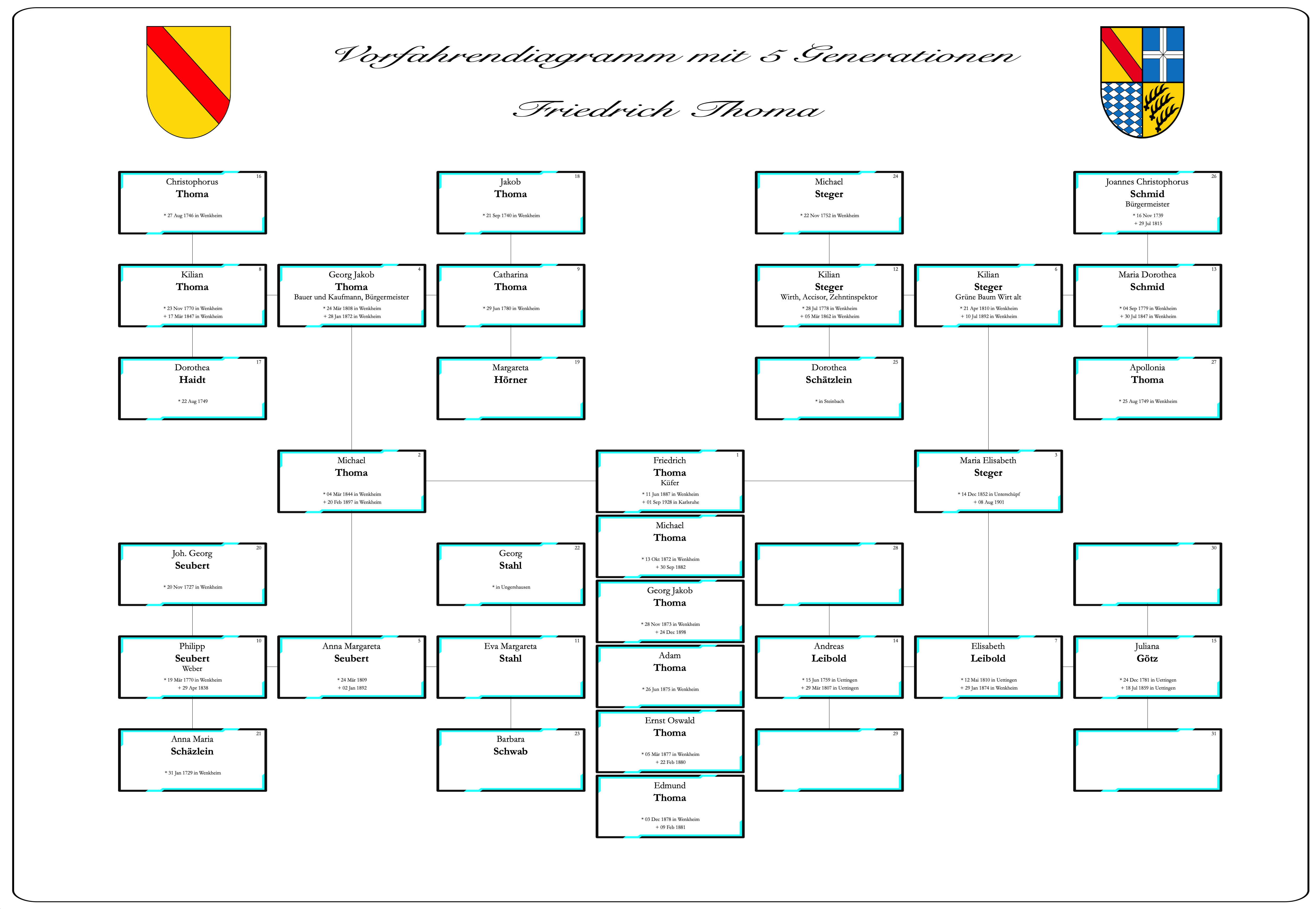 49kB) 15.07.2022 Drei weitere Druckvorlagen zur Ausgabe einer Ahnentafel mit vier, fünf oder neun Generationen. Bei dieser Darstellung wurde eine sehr Platz sparende Variante verwendet, bei der die jeweiligen Elternteile nach rechts und links, bzw. oben und unten verteilt werden. Bei der Ausgabe von neun Generationen ist eine Ausgabe auf DIN A 2 ratsam, um die Daten lesen zu können. Eine Ausgabe auf einem kleineren Ausgabeformat wird ggf. nur ein Teil der Darstellung gedruckt. Hier empfiehlt sich die Ausgabe als Bild und anschließender Druck aus einem Grafikprogramm. |