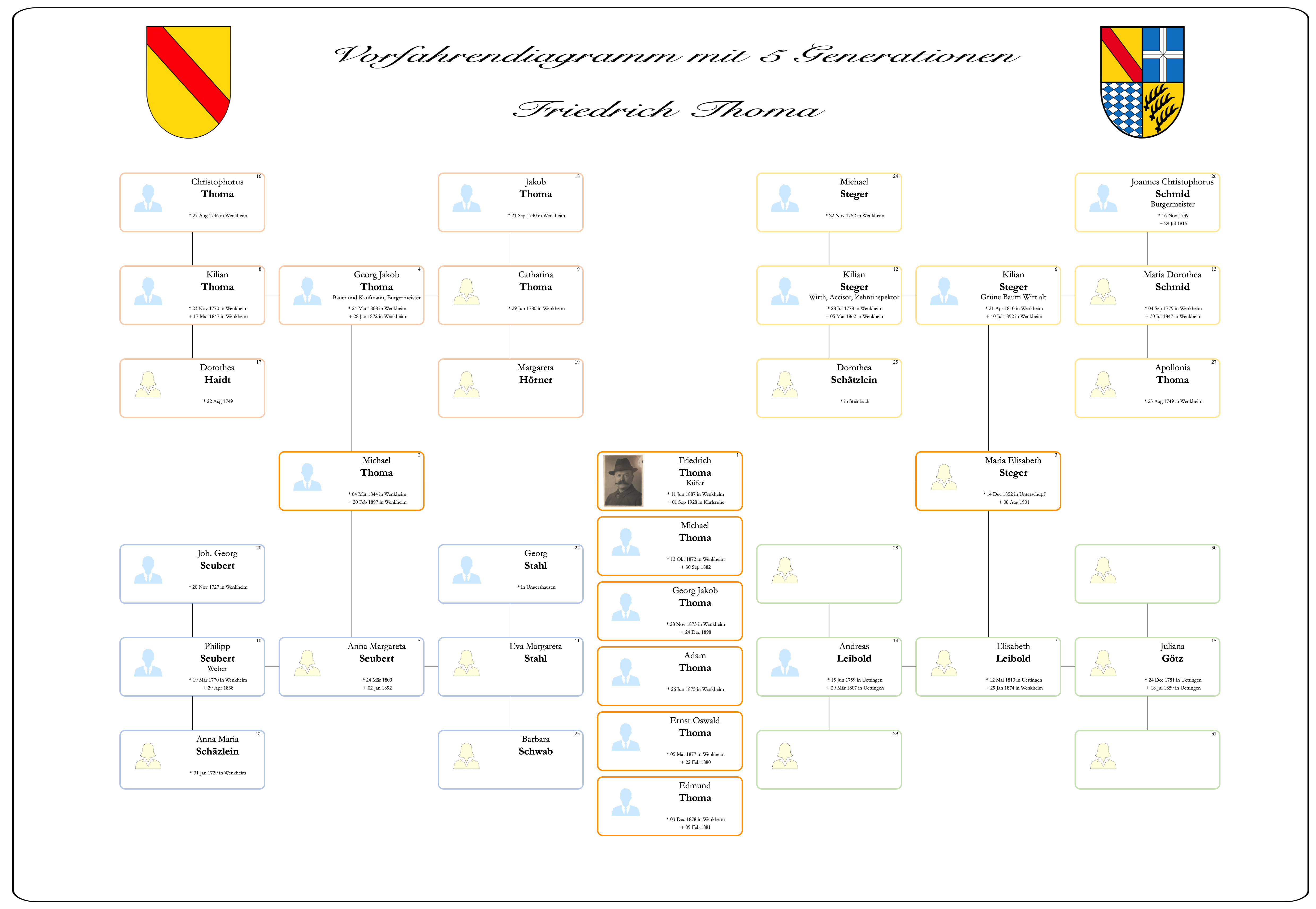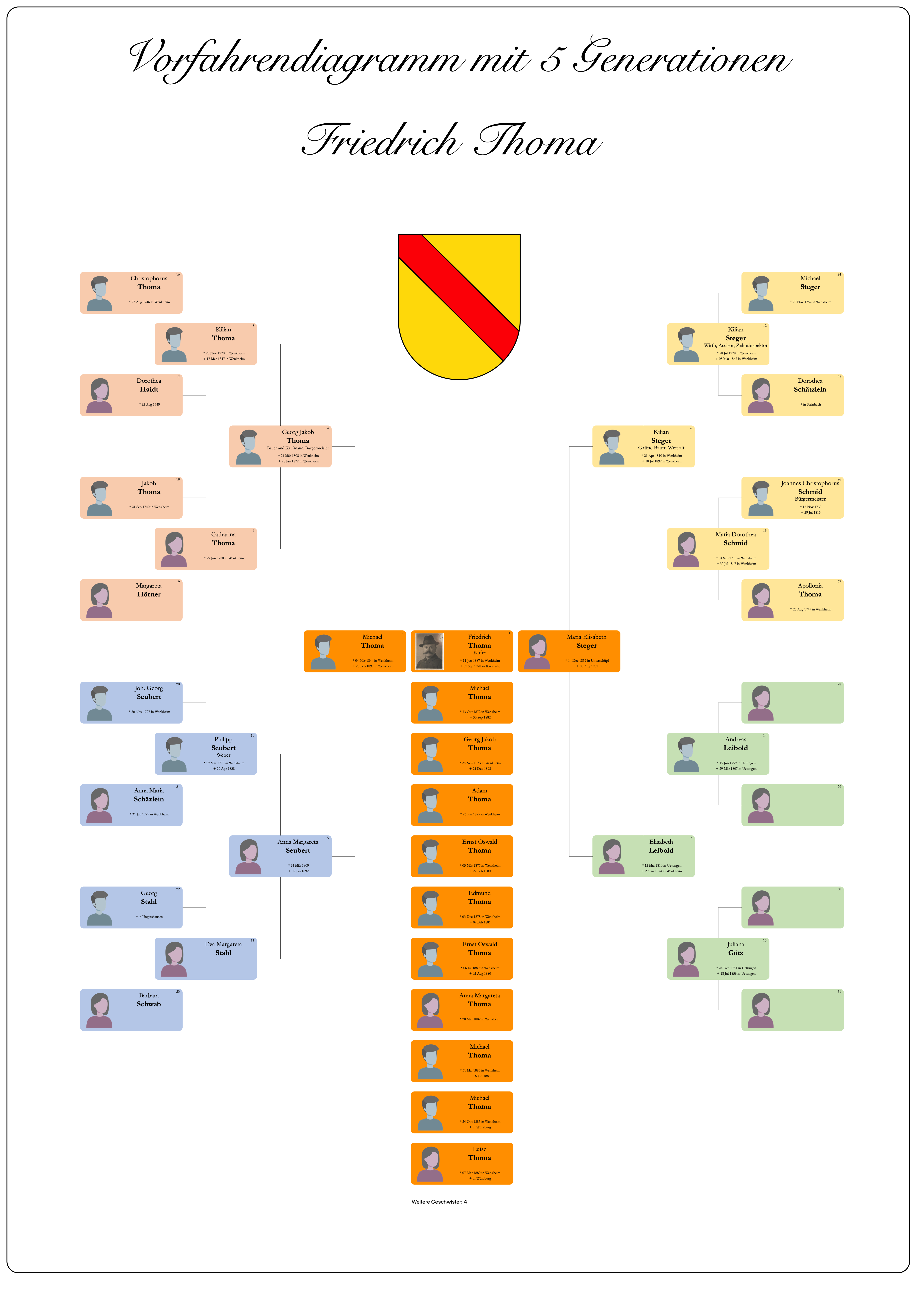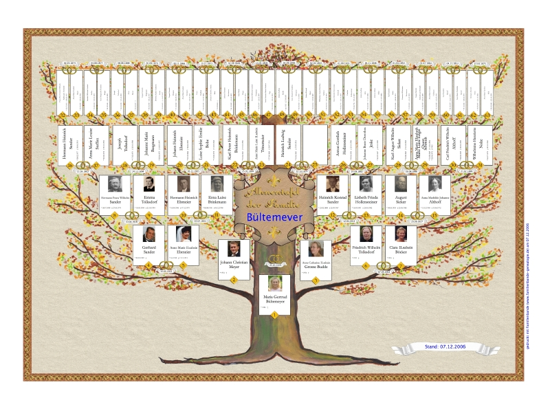 7,6MB) 03.10.2018 Eine Vorlage zum Erzeugen eines Schmuckbildes mit 7 Generationen. Die Vorlage enthält auch das Hintergrundbild (3500x2590 Pixel) und ist deshalb sehr groß. Dafür sollte aber auch ein Ausdruck in Din A0 noch sehr ansprechend sein. Die Grundgröße wurde auf 9921x13700 erhöht (Das Hintergrundbild bleibt unverändert). Dadurch wird die Schrift deutlich schärfer und auch für große Ausgaben besser geeignet. Zudem ist ein Benutzerdialog hinzugekommen, der u. a. die Einbindung einer zusätzlichen Grafik (z. B. ein Wappen) und die Wahl der Schriftart ermöglich. |