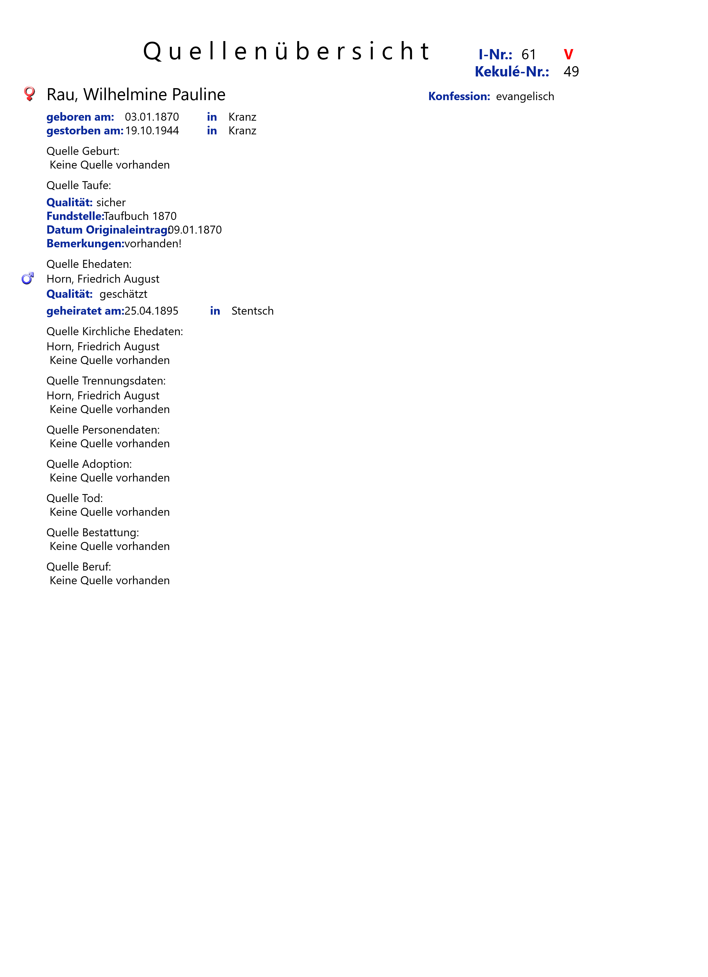 KB) 15.01.2015 Hier sind Druckvorlagen für die Ausgabe aller Quellenangaben von GEBURT, TAUFE, EHE EHE_KIRCHE und TOT. Es werden nur Personen ausgegeben, die auch Eintragungen in den jeweiligen Originaltexten enthalten, gilt für alle Vorlagen. Es empfiehlt sich, den beiliegenden Hinweistext zu lesen! |