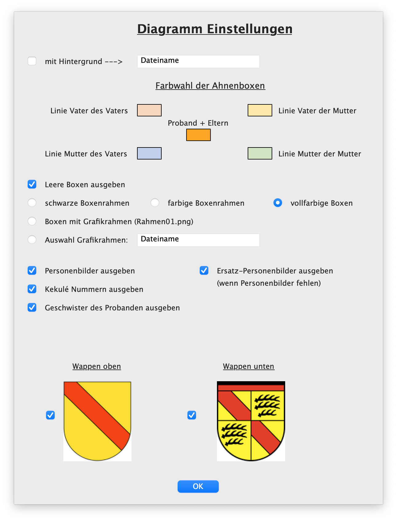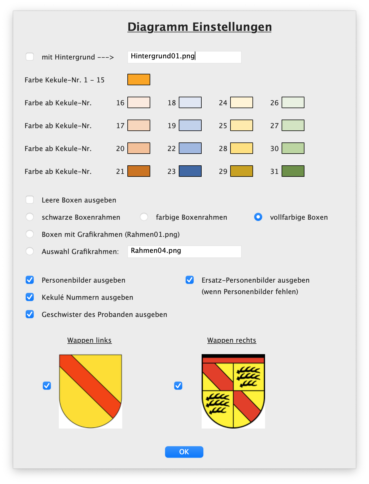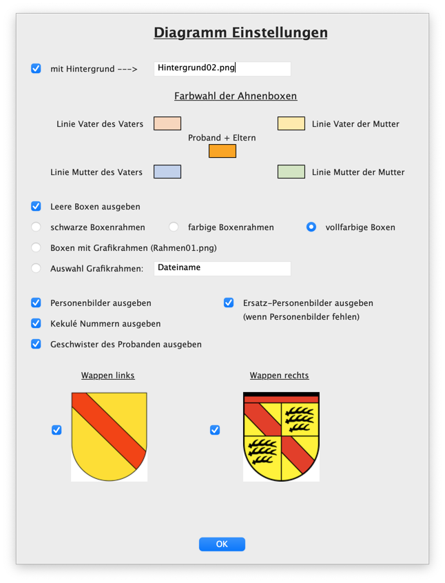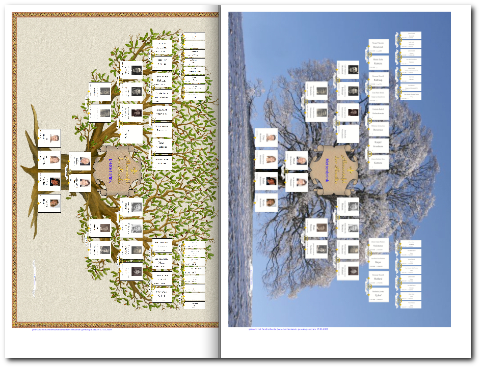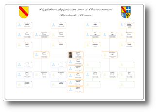 26,7MB) 15.11.2022![]() Diese Vorlage ist eine Weiterentwicklung der Vorlagen aus H-Tree. Auch hier wurde dieselbe platzsparende Darstellungsvariante gewählt. Zu Beginn wird dem Anwender ein Benutzerdialog angeboten, in dem verschiedene Vorgaben zu den Farben und Hintergründen vorgegeben werden können. Ebenso kann eine Hintergrundgrafik, Rahmen für die Personendaten und die Ausgabe von zwei Bildern im Bereich der Überschrift (Im Beispiel wurden Wappen gewählt) eingestellt werden. Auch die Ausgabe der Anzeigebilder ist möglich. Es ist derzeit nur möglich, diese Darstellung als Bild (PNG) zu sichern und anschließend über ein Grafikprogramm zu drücken. Einige der verwendeten Grafiken stammen von studiogstock: Designed by studiogstock / Freepik |