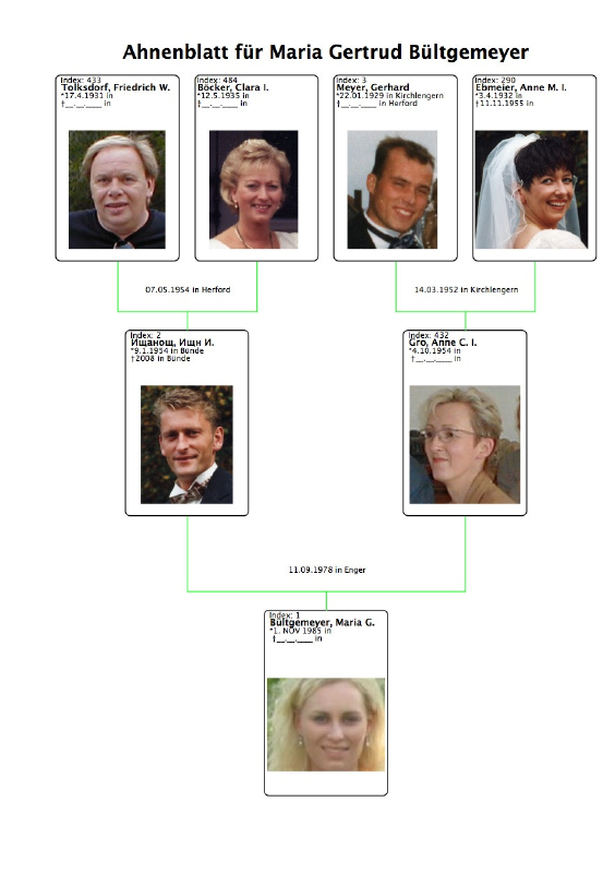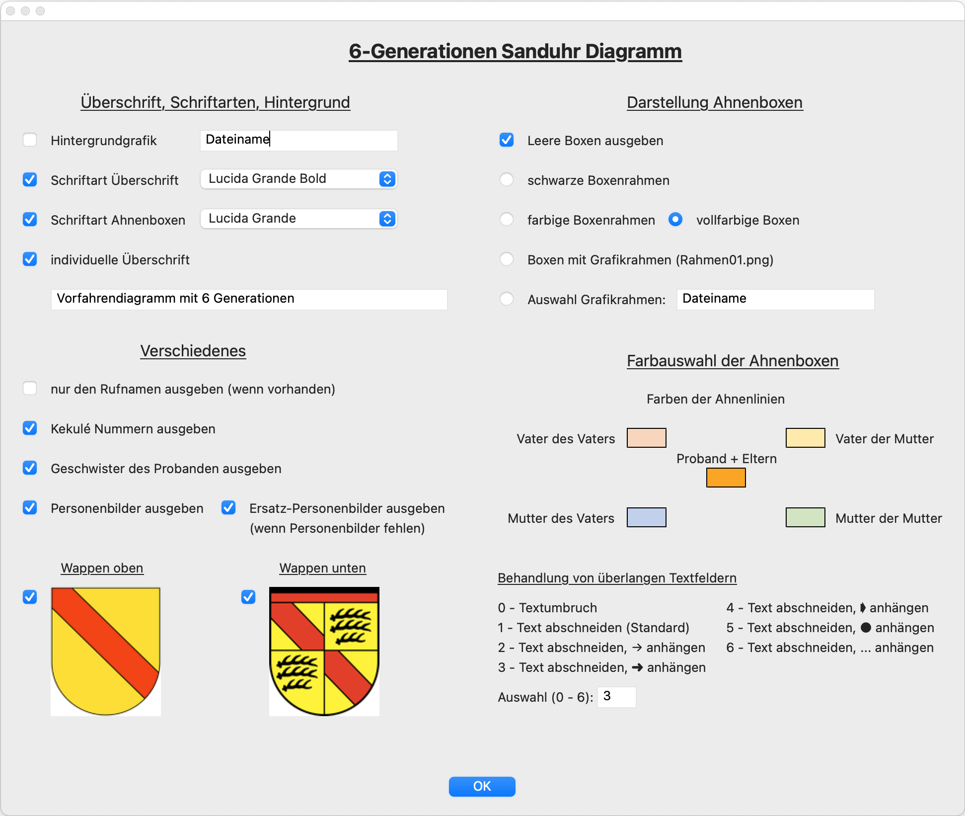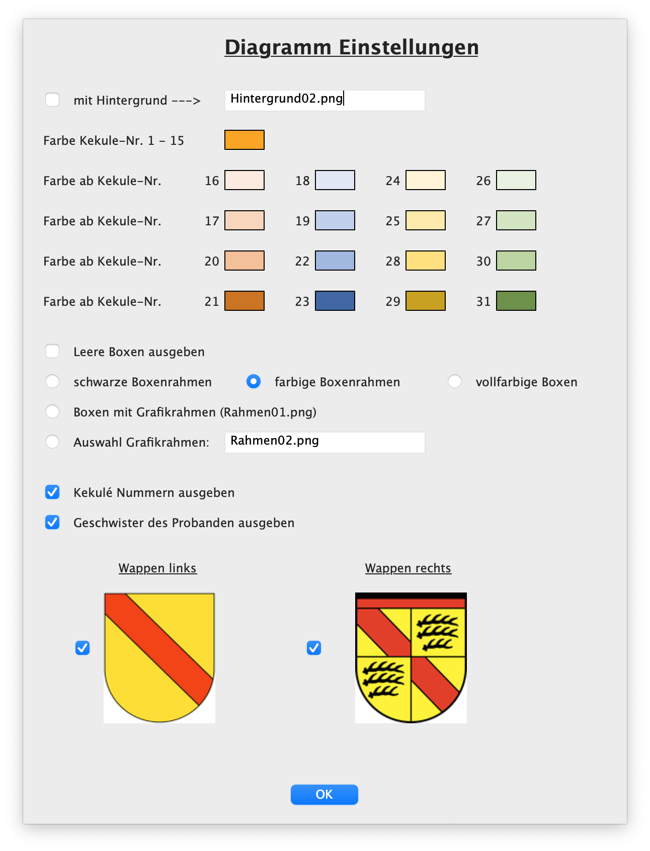 26,7MB) 15.11.2022![]() Diese Vorlage ist eine Weiterentwicklung der Vorlagen aus H-Tree. Auch hier wurde dieselbe platzsparende Darstellungsvariante gewählt. Zu Beginn wird dem Anwender ein Benutzerdialog angeboten, in dem verschiedene Vorgaben zu den Farben und Hintergründen vorgegeben werden können. Ebenso kann eine Hintergrundgrafik, Rahmen für die Personendaten und die Ausgabe von zwei Bildern im Bereich der Überschrift (Im Beispiel wurden Wappen gewählt) eingestellt werden. Auch die Ausgabe der Anzeigebilder ist möglich. Es ist derzeit nur möglich, diese Darstellung als Bild (PNG) zu sichern und anschließend über ein Grafikprogramm zu drücken. Einige der verwendeten Grafiken stammen von studiogstock: Designed by studiogstock / Freepik |