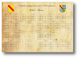 26,7MB) 18.11.2022![]() Ein schönes Sanduhrddiagramm über sieben Generationen in übersichtlicher Darstellung. Zu Beginn wird dem Anwender ein Benutzerdialog angeboten, in dem verschiedene Vorgaben zu den Farben und Hintergründen vorgegeben werden können. Ebenso kann eine Hintergrundgrafik, Rahmen für die Personendaten und die Ausgabe von zwei Bildern im Bereich der Überschrift (Im Beispiel wurden Wappen gewählt) eingestellt werden. Auch die Ausgabe der Anzeigebilder ist möglich. Es ist derzeit nur möglich, diese Darstellung als Bild (PNG) zu sichern und anschließend über ein Grafikprogramm zu drücken. Einige der verwendeten Grafiken stammen von studiogstock: Designed by studiogstock / Freepik |
