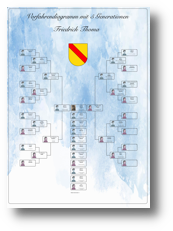 26,7MB) 18.11.2022![]() Ein schönes Sanduhrddiagramm über fünf Generationen in übersichtlicher Darstellung. Zu Beginn wird dem Anwender ein Benutzerdialog angeboten, in dem verschiedene Vorgaben zu den Farben und Hintergründen vorgegeben werden können. Ebenso kann eine Hintergrundgrafik, Rahmen für die Personendaten und die Ausgabe von zwei Bildern im Bereich der Überschrift (Im Beispiel wurden Wappen gewählt) eingestellt werden. Auch die Ausgabe der Anzeigebilder ist möglich. Es ist derzeit nur möglich, diese Darstellung als Bild (PNG) zu sichern und anschließend über ein Grafikprogramm zu drücken. Einige der verwendeten Grafiken stammen von studiogstock: Designed by studiogstock / Freepik |