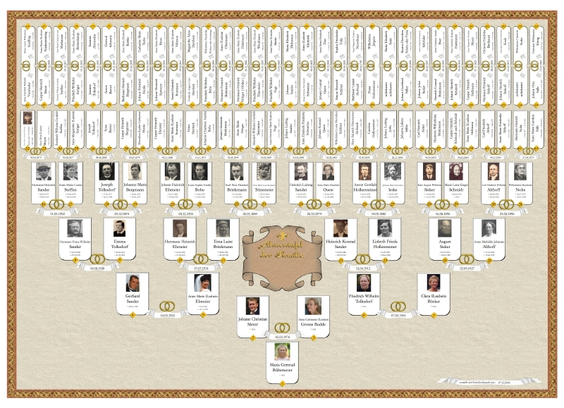 8,5MB) 22.09.2020 Eine Vorlage zum Erzeugen eines Schmuckbildes mit 6 Generationen. Die Vorlage enthält auch das Hintergrundbild (3500x2590 Pixel) und ist deshalb sehr groß. Dafür sollte aber auch ein Ausdruck in Din A0 noch sehr ansprechend sein. |