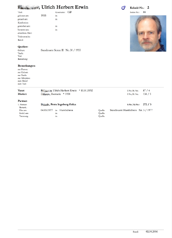 116KB) 27.03.2020 Diese Vorlage erzeugt ein Stammblatt im Format Din A4 mit maximal 3 Ehen und 20 Kindern. Es wird nicht berücksichtigt, ob die Daten alle auf die Seite passen, ggf. müsste die Vorlage mal jemand entsprechend überarbeiten. Mitgeliefert werden zwei kleine Grafiken für die Symbole männlich und weiblich. Es wurden weitere Exportvorlagen auf dieser Grundlage hinzugefügt und in ein gemeinsames Archiv gepackt. |