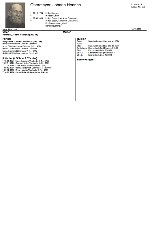 8KB) 12.12.2010 Für Karteikarten im Format Din A5 quer eignet sich diese Vorlage. Sie enthält die wesentlichen Angaben zur Person incl. aller Ehen und Kinder. Die Kinder werden immer direkt unter die Ehen geschrieben und notfalls die ganze Din A4 Größe benutzt. Daneben werden Angaben zu den Quellen und den Bemerkungen ausgegeben. Auch hier wird der Platz der gesamten Din A4 Seite ausgenutzt. |