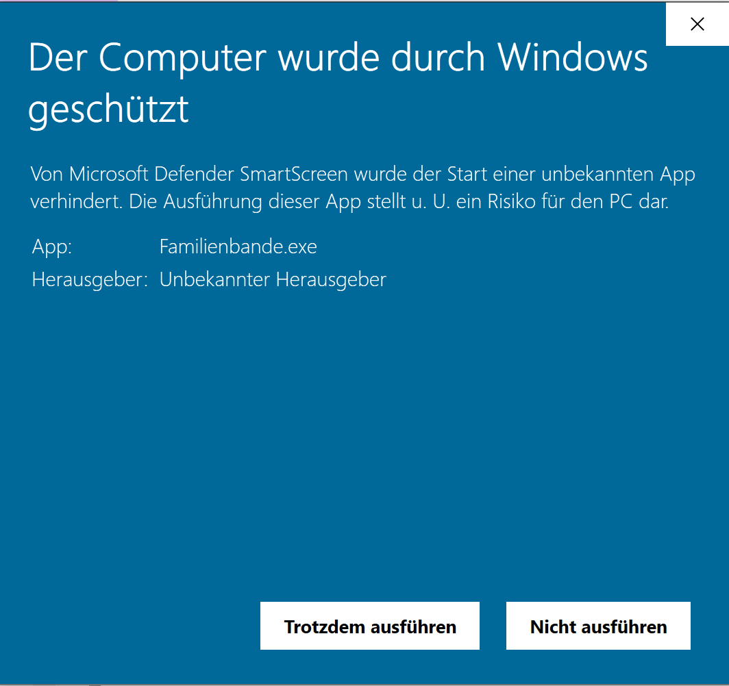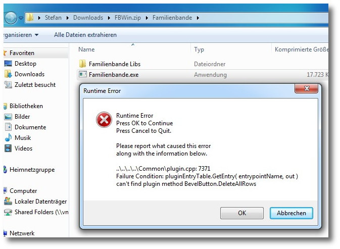 Sie haben die aktuelle Windows-Version von Familienbande herunter geladen und das Zip-Archiv geöffnet. Wenn Sie das Programm starten erhalten Sie nachfolgende Fehlermeldung: