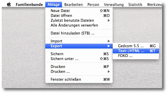 Starten Sie nun Familienbande und laden Sie Ihre Daten (sofern das nicht automatisch geschieht). Rufen Sie den Textexport auf (unter Windows heißt das "Ablage"-Menü "Datei")