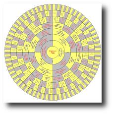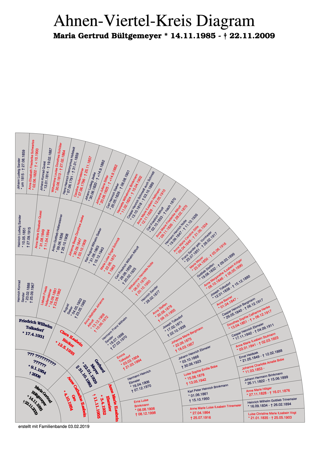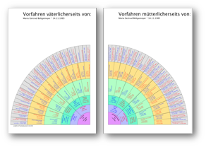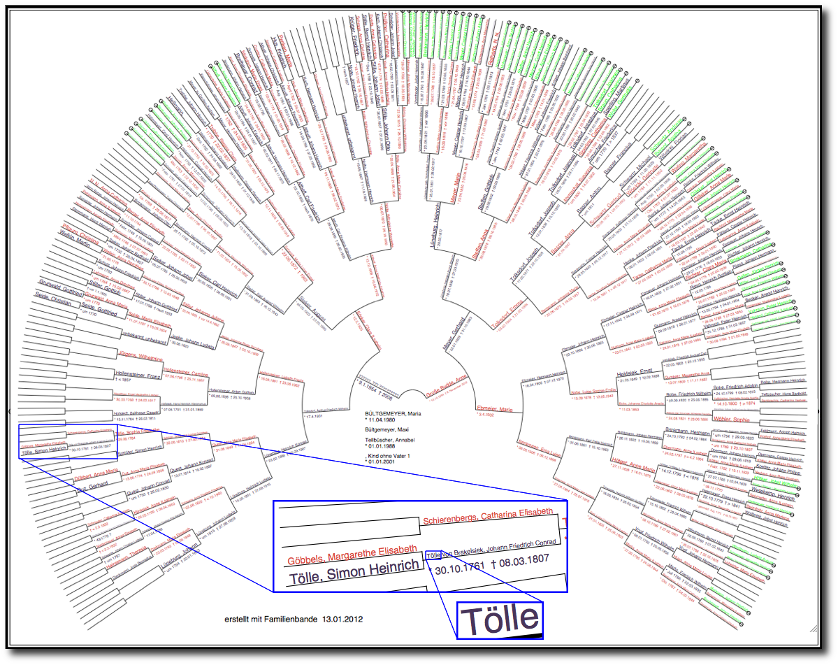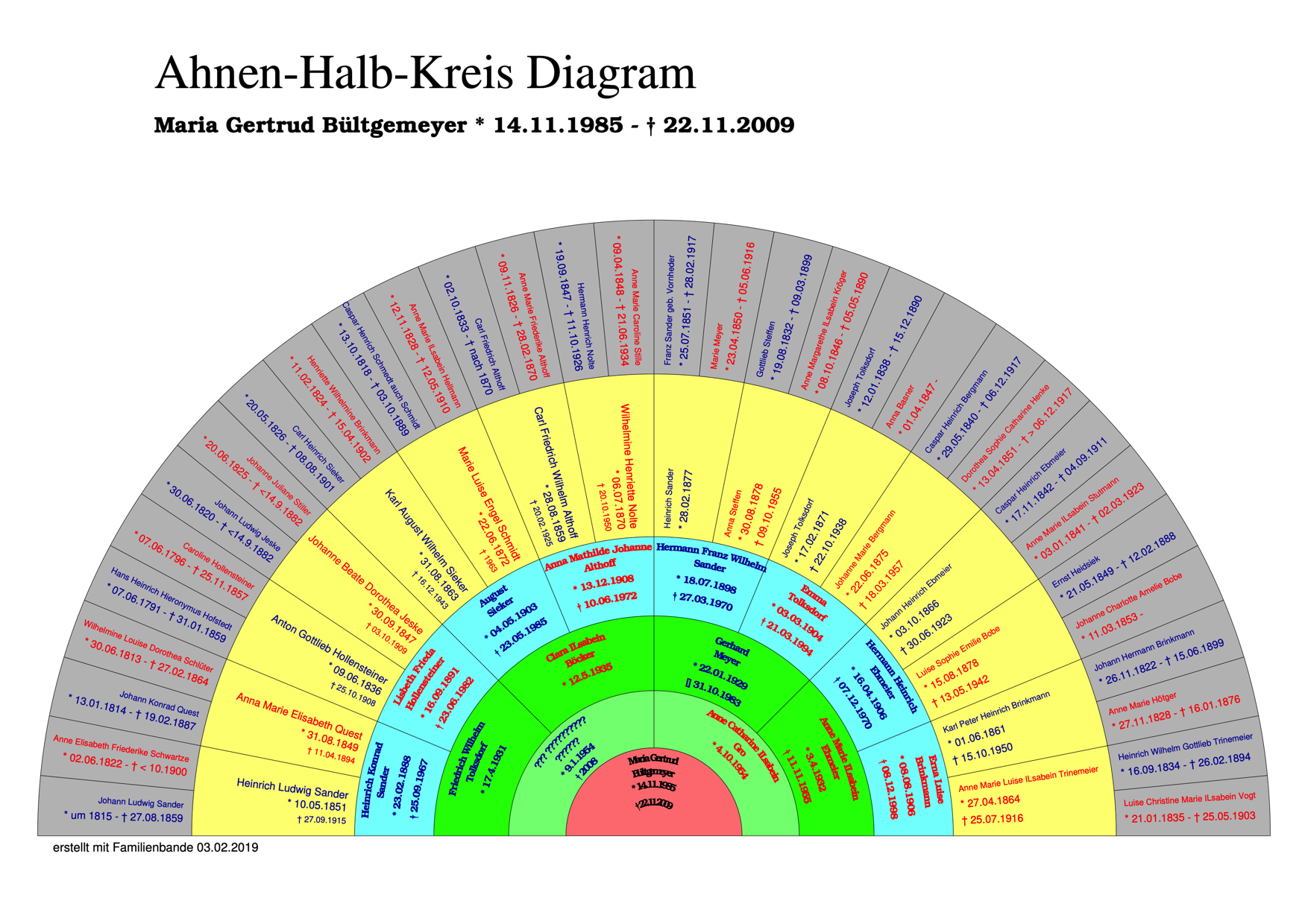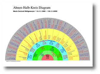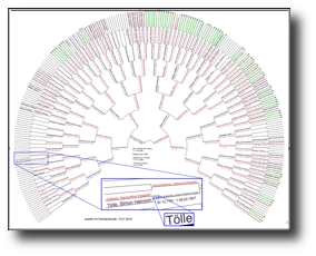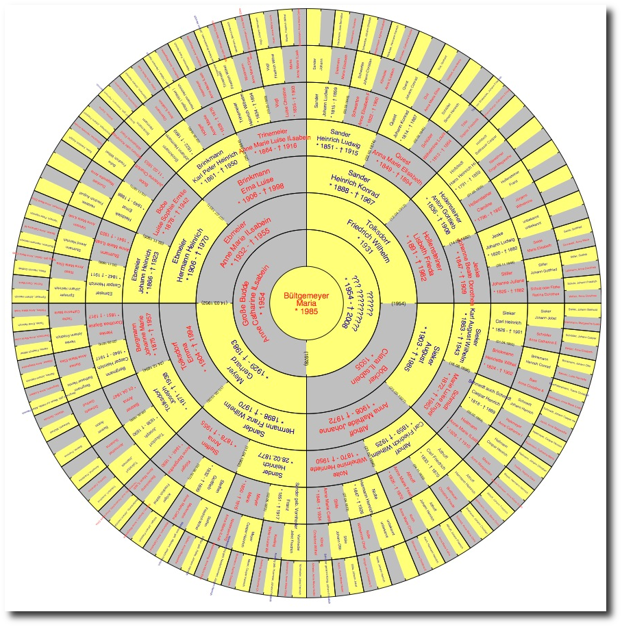 Halbkreis(download 3MB) 19.03.2023 Mit dieser Vorlage erzeugen Sie eine Fächerförmige Darstellung einer Ahnentafel mit 6 Generationen. Es wird eine Postscriptdatei erzeugt, die eine maximale Auflösung in allen Vergrößerungsstufen ermöglicht. Mein besonderer Dank gebührt Jeffrey Coffield <www.digitalsynergyinc.com>, der die Grundlage der Postscriptdatei erstellt hat! Diese Vorlage existiert auch als integriete Textvorlage direkt in Familienbande. Hier ist sie zusätzlich als Download erhältlich, damit man sie ggf an seine eigenen Bedürfnisse anpassen kann. Die neue Varainte mach davon Gebrauch und ist jetzt in zwei Varianten verfügbar. Die Unterschiede beziehen sich hier lediglich auf die letzte Gereration. Hier werden Geburts- und Sterbedatum in einer der zwei Zeilen ausgegeben. Somit ist die Ausgabe der letzten Gereration drei- oder vierzeilig. Unter Windows und Linux benötigen Sie zur Anzeige von Postscriptdateien zusätzliche Software. Ich habe „Postscript Viewer“ als gute und kostenlos Möglichkeit gefunden. Inzwischen hat Apple das Programm "Vorschau" hinsichtlich der Postscriptausgabe beschnitten. Seit macOS 13 (Ventura) werden Postscript-Dateien von "Vorschau" nicht mehr angezeigt. Als Alternative habe ich den PDF-Reader Skim gefunden. Eine ebenfalls mögliche Variante sind die in macOS verfügbaren Ordneraktionen. Ich habe das in den FAQ beschrieben. |