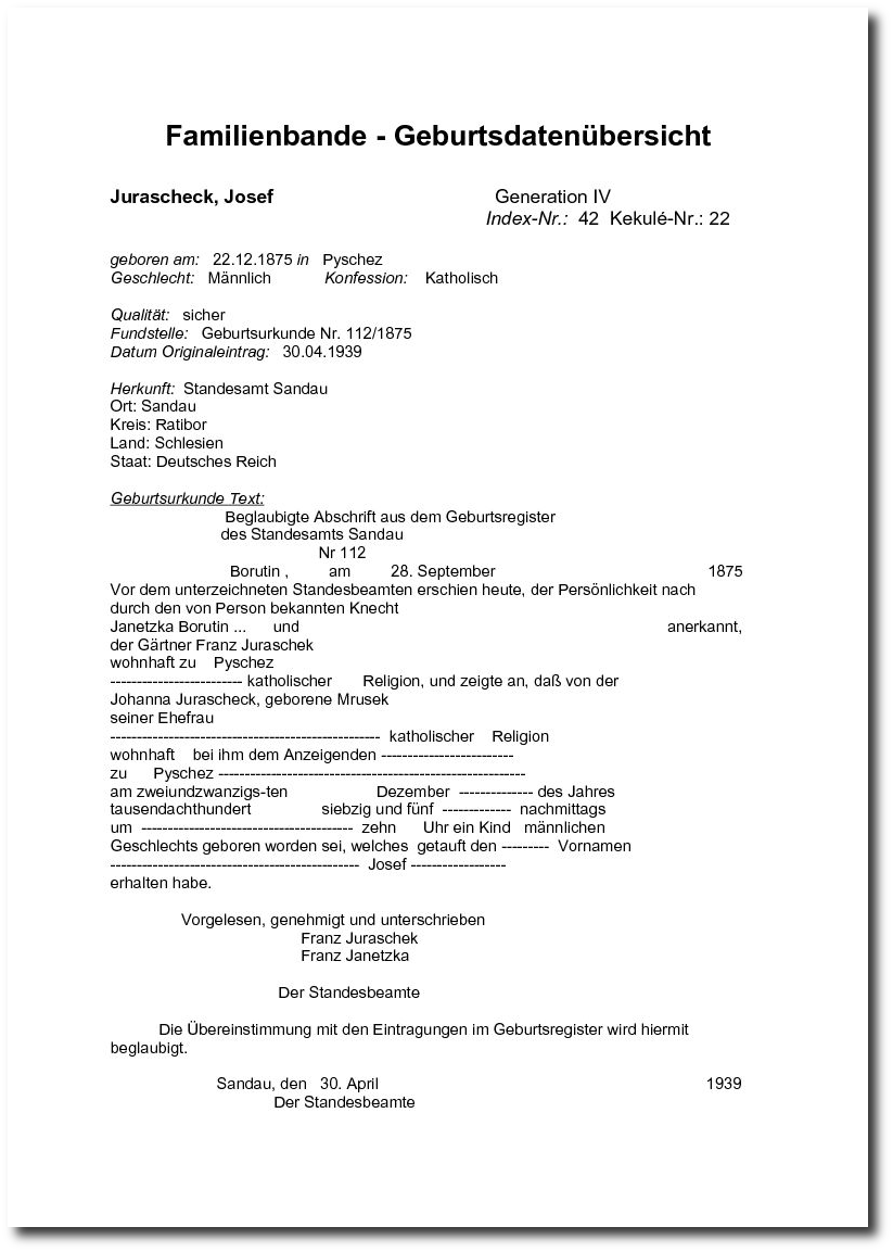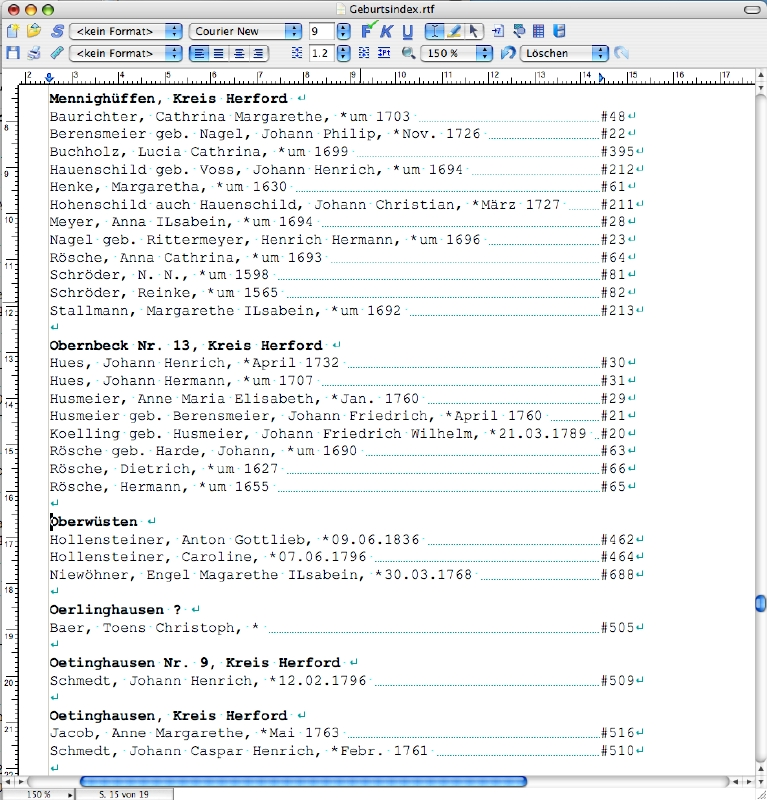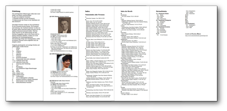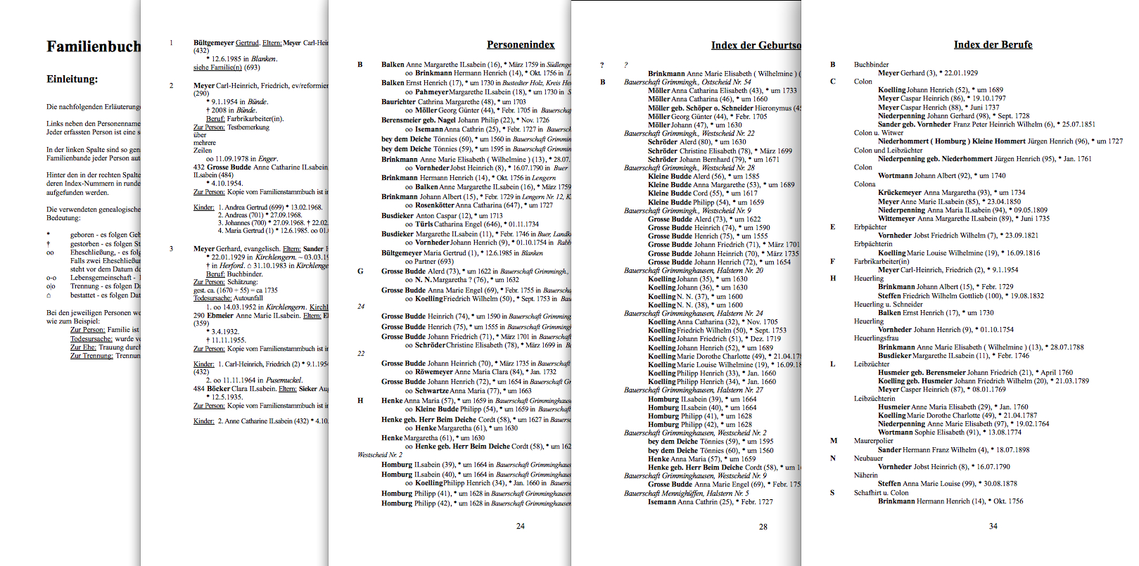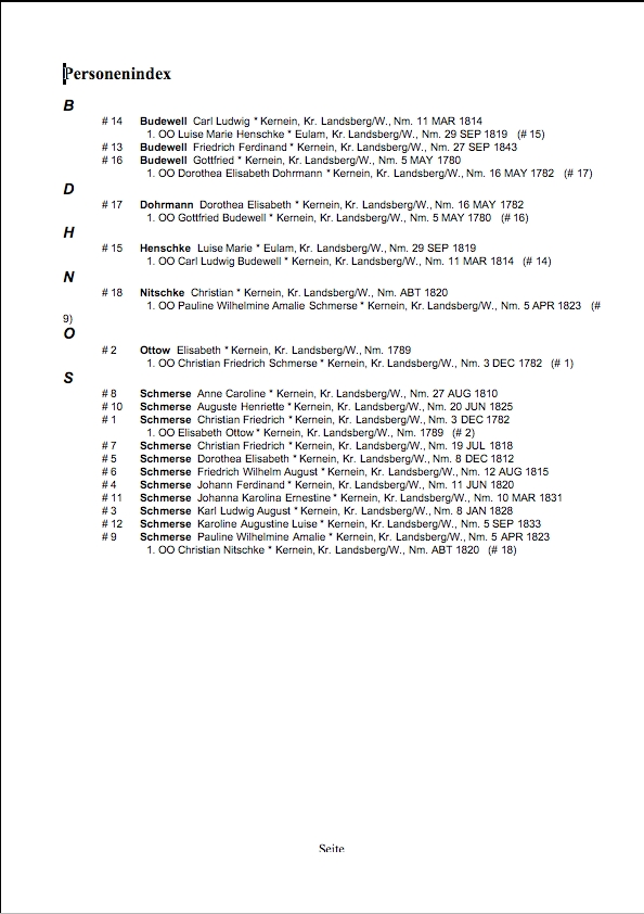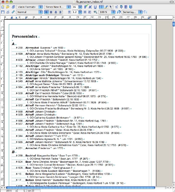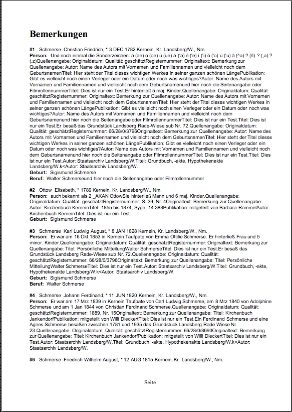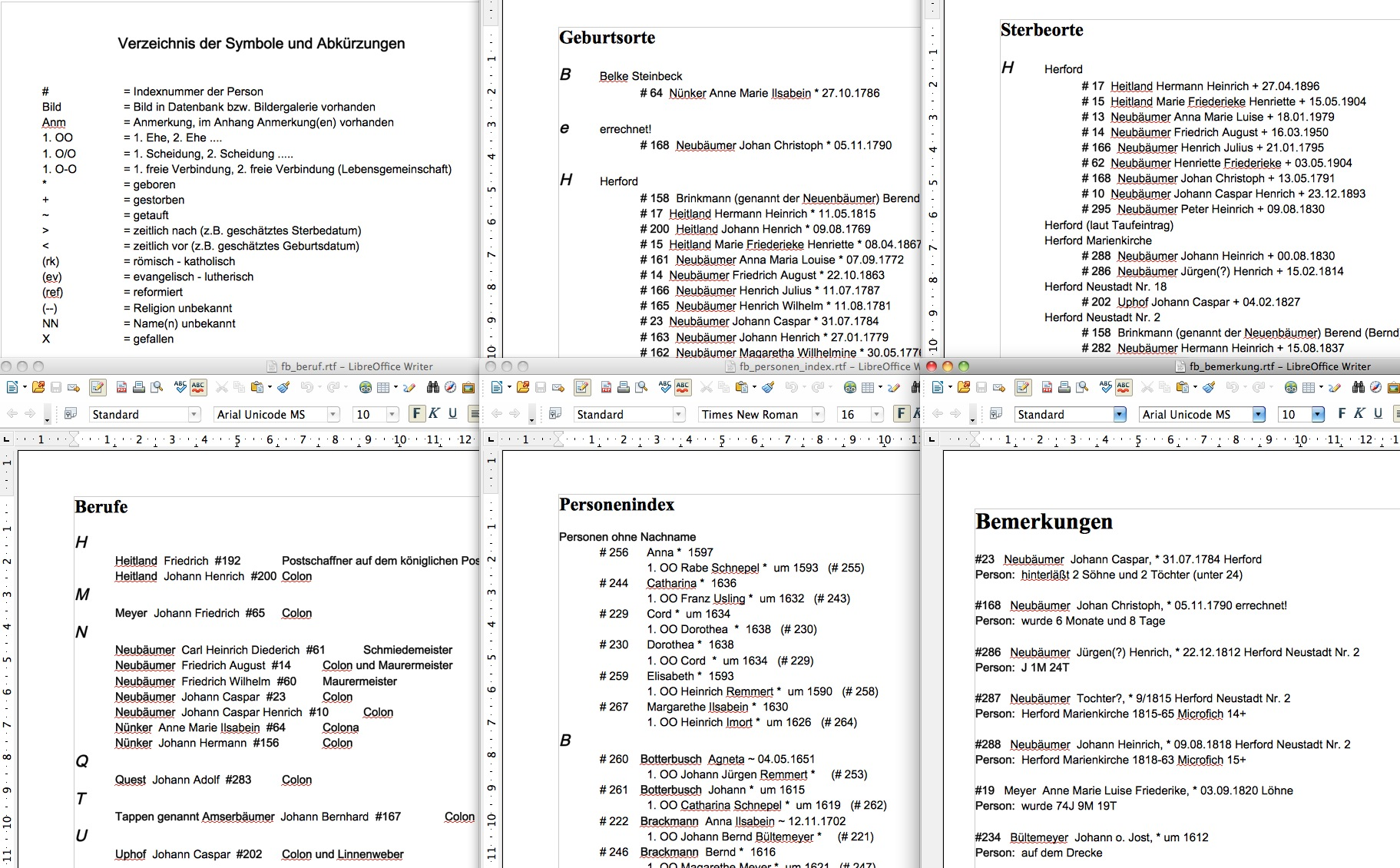 56kB) 21.09.2008 Hiermit können Sie ein komplettes Buch mit allen Daten der exportieren Personen erzeugen. Folgendes wird erzeugt: Vorspann bzw. Vorwort mit einer kurzen Erklärung Hauptteil mit den Personenangaben Personenindex, alphabetisch Index der Geburtsorte nach Ort, alphabetisch Index der Sterbeorte nach Ort, alphabetisch Index der Berufe nach Beruf, alphabetisch Verzeichnis der Herkunft, alphabetisch Verzeichnis der Quellen nach Name, alphabetisch |