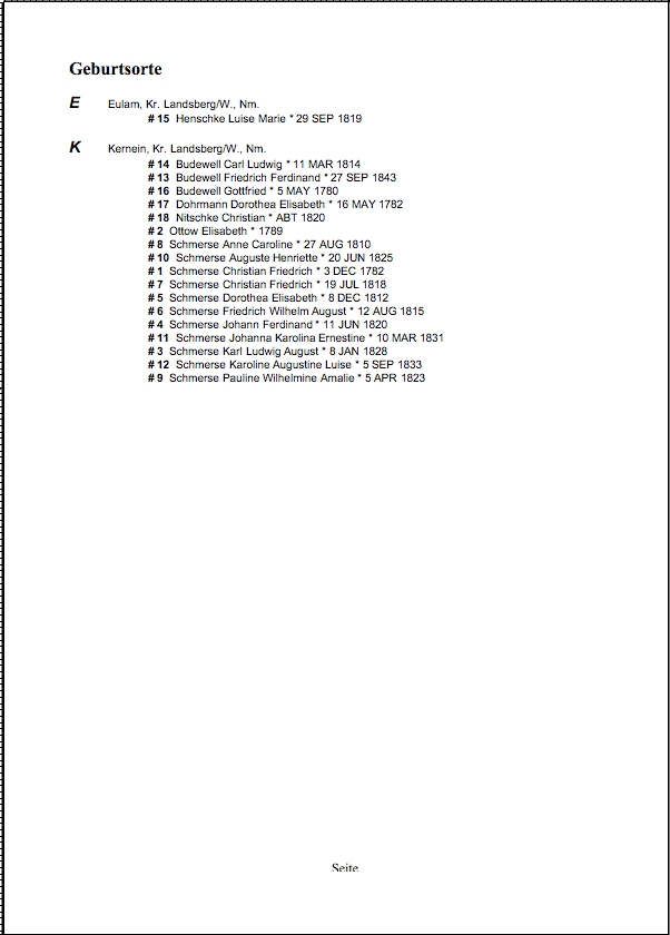 4kB) 07.12.2006 Wie schon die vorherige Vorlage erzeugt auch diese eine RTF-Datei zum Importieren in eine Textverarbeitung. Die erzeugte Datei enthält eine Personenliste, in der alle Personen nach Geburts- oder Taufort sortiert angegeben sind. |