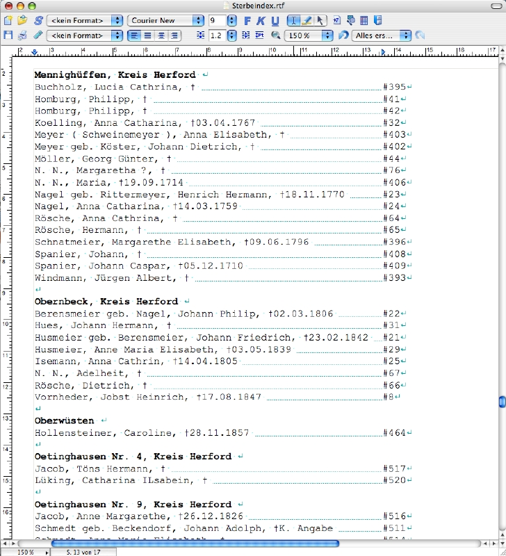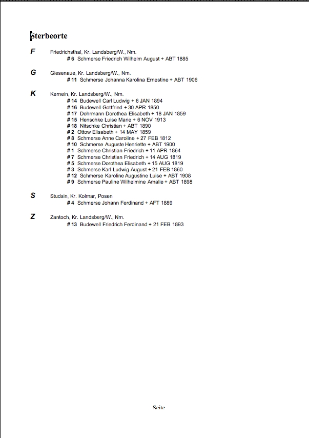4kB) 07.12.2006 Die Vorlage Sterbeindex-rtf.EVL erzeugt eine RTF-Datei, in der alle Personen nach Sterbeort sortiert aufgeführt werden. Die erzeugte Datei kann in einer beliebigen Textverarbeitung geöffnet werden und eignet sich hervorragend als Zusatz zu einem Familienregister. |