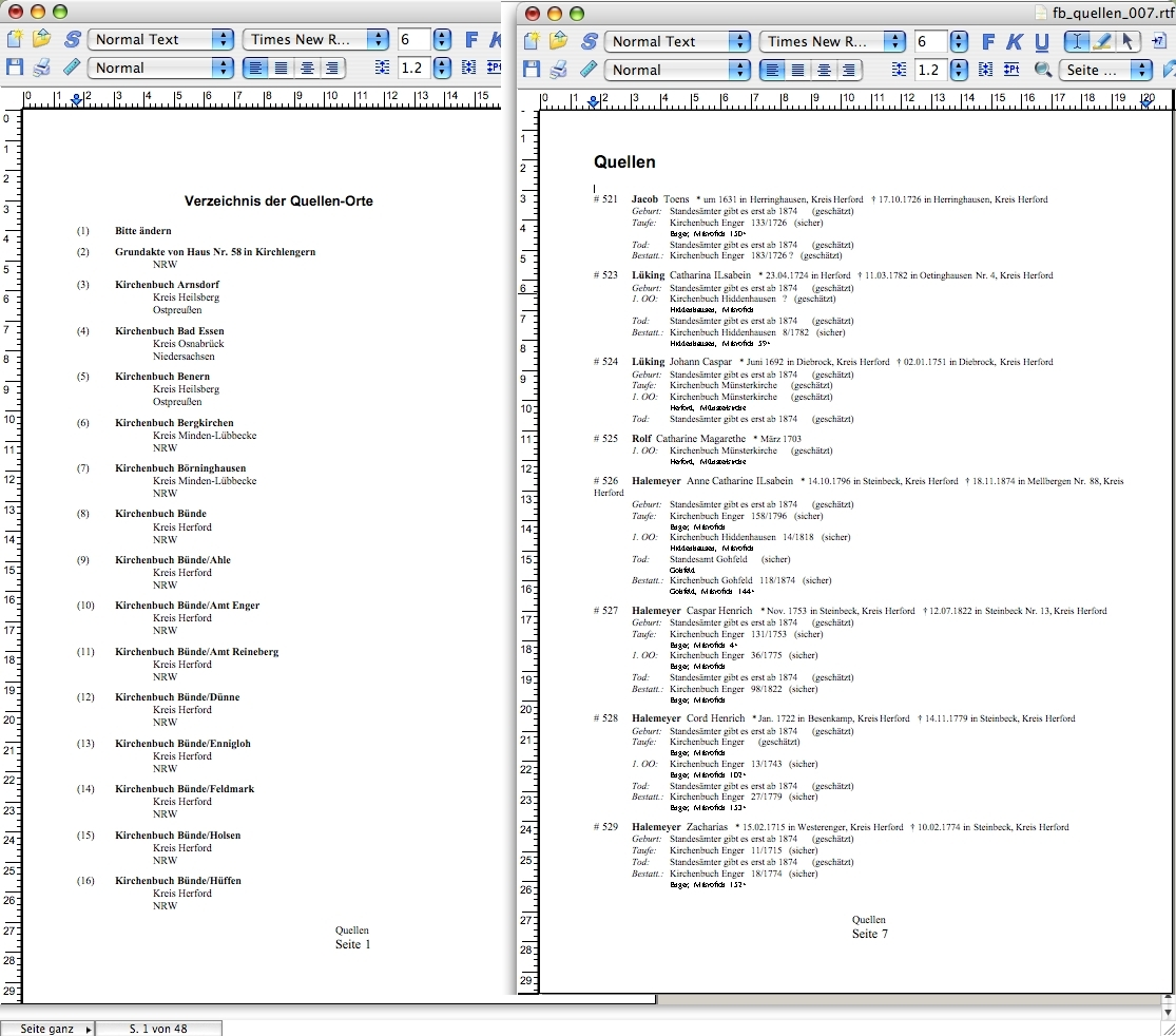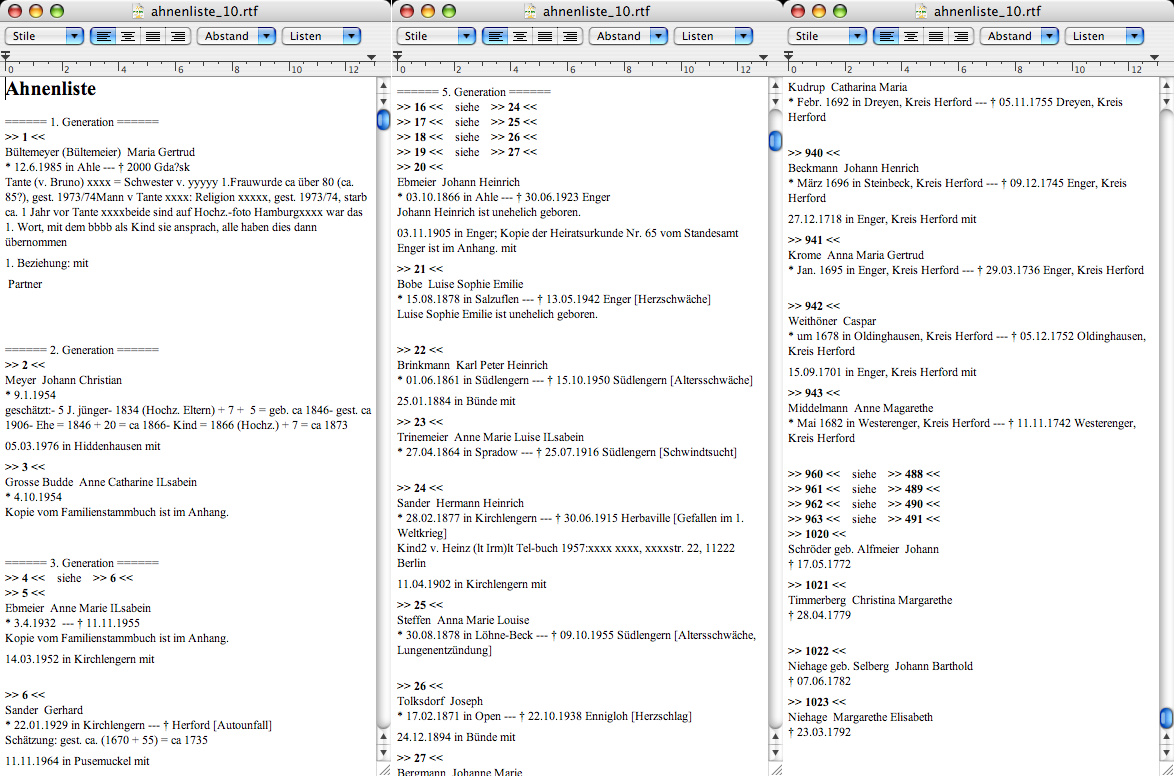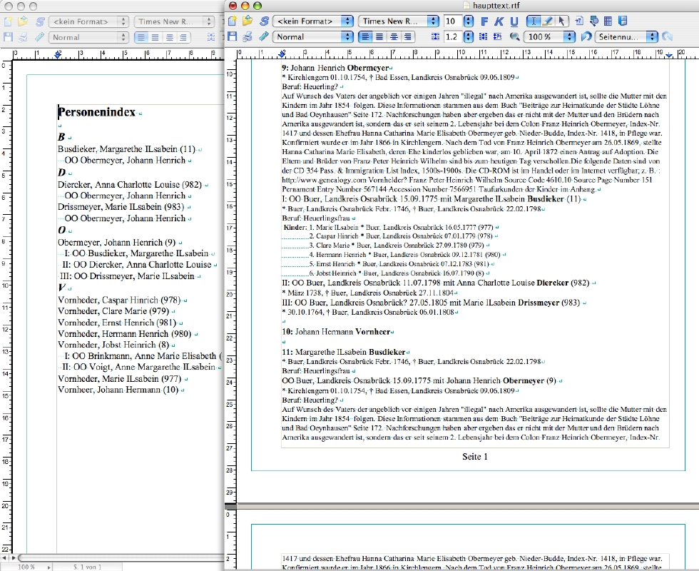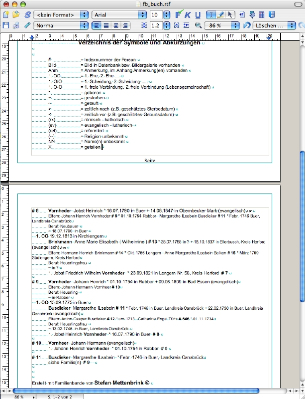 12kB) 07.12.2007 Speziell für Andreas Abel wurden diese Vorlage erstellt. Sie erzeugen Dateien im Ritch-Text-Format (RTF), die in eine Textverarbeitung (hier Papyrus Office) geladen werden kann. Es werden die Dateien "index.rtf" und "haupttext.rtf" erzeugt. Zusammen ergeben sie ein Familienbuch. Die neue Version ist nicht mehr so speziell auf die Bedürfnisse von Andreas abgestimmt. |