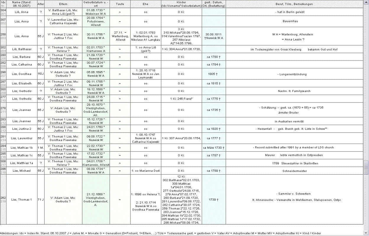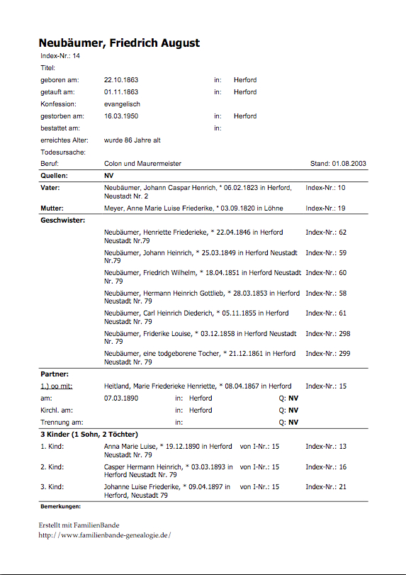 40kB) 31.03.2009 Diese Vorlage gibt eine Ahnenliste im rtf-Format aus. Sie kann mit jeder üblichen Textverarbeitung geöffnet und dann weiterverarbeitet oder gedruckt werden. In der Generation 1 wird der Proband mit allen Geschwistern (ohne Halb- oder Stiefgeschwister) ausgegeben, der Kekulé-Nr. wird ein Buchstabe gemäß der Altersreihenfolge hinzugefügt (1 A, 1 B usw.). Auch sämtliche (eingetragenen) Beziehungen in der Generation 1 werden einschließlich der jeweiligen Partner berücksichtigt. Es werden zumindest der Name sowie Geburts-, Hochzeits- und Sterbedatum exportiert, die übrigen Informationen können Sie nach Belieben auswählen. Eine Eheschließung wird mit „OO“ gekennzeichnet. |