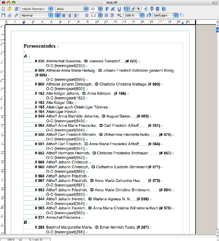 4kB) 07.12.2006 Zum Erzeugen eines alphabetischen Personenindex eignet sich diese Vorlage. Wie die Vorlagen zuvor, erzeugt auch diese Vorlage eine RTF-Datei, die Sie in einer Textverarbeitung (hier Papyrus Office) öffnen können. Dort können Sie auch noch Korrekturen vornehmen und die Seitengestaltung verändern. |