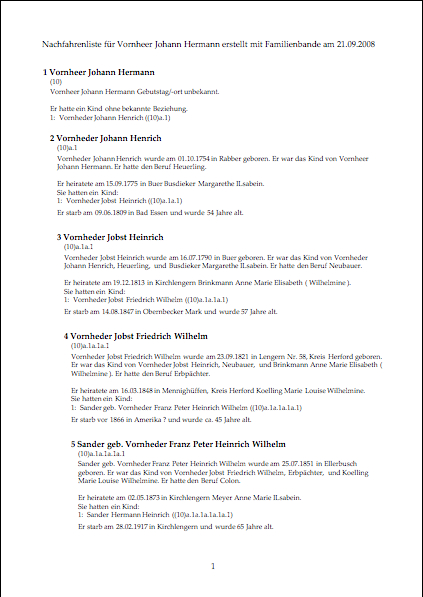 12kB) 06.02.2009 Die Vorlage erzeugt eine Generationenliste sortiert nach Kekulénummer bis max. 29 Generationen. Zu den Personen sind alle wesentlichen Daten enthalten. Zusätzlich kann noch ein Personenindex erzeugt werden. Vor dem eigentlichen Export kann durch den Benutzerdialog Einfluss auf das Exportergebnis genommen werden. |