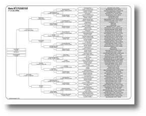 Ahn_Tafel 5(download 8kB) 12.01.2015 Erneut eine Vorlage, die als Ergebnis eine Postscript-Datei erzeugt. Diesmal werden die Daten von fünf Generationen ausgegeben. Die Darstellung ist sehr übersichtlich und enthält die wesentlichen Daten der Personen. Die nebenstehende Beispielausgabe zeigt für die ersten Generationen als Datumsangaben nur den Text "lebend". Hierfür wurde in den Einstellungen zu Familienbande die entsprechende Datenschutzeinstellung gewählt. Sie können selbstverständlich auch die konkreten Daten ausgeben Unter Windows und Linux benötigen Sie zur Anzeige von Postscriptdateien zusätzliche Software. Ich habe „Postscript Viewer“ als gute und kostenlos Möglichkeit gefunden. |