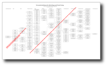 Verwandtschaftsbeziehungen (download 90kB) 20.05.2012 Diese Vorlagen, bieten eine Grundlage, um die kompletten Verwandtschaftsbeziehungen in dem kostenlosen Programm GraphViz übersichtlich ausgeben zu können. Es handelt sich derzeit um keine fertige Vorlage, sondern um eine Grundlage für weitere Ausarbeitungen, die zu einer hochwertigen Ausgabe führen können. Wie das spätere Ergebnis aussehen könnte, ist nebenstehend ansatzweise zu erkennen. |